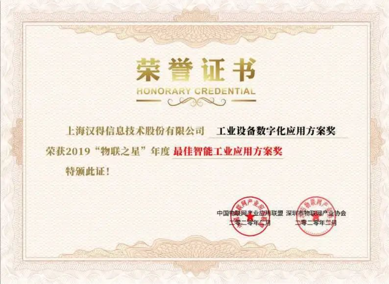 2020年2月25日,经过4个月的申报、专家评审、公示等环节,2019年物联之星中国物联网行业年度评选获奖名单正式公布。上海万象城AWC信息技术股份有限公司荣获工业设备数字化应用方案奖—— 2019“物联之星”年度最佳智能工业应用方案奖。中国物联网最佳智能工业应用方案万象城AWC智能工业应用方案,凭借自身在工业信息化领域拥有多年的技术经验,结合万象城AWC物联网中台Hi-IoT平台,为企业提出多场景解决方案,帮助企业构建工业物联网平台,解决设备管理、数据采集、设备监控、故障诊断、预测维护等一系列痛点。同时,针对工业设备及产品数字化管理的产品组合,给予端到端的一体化解决方案:“设备健康管理”等SaaS应用 +