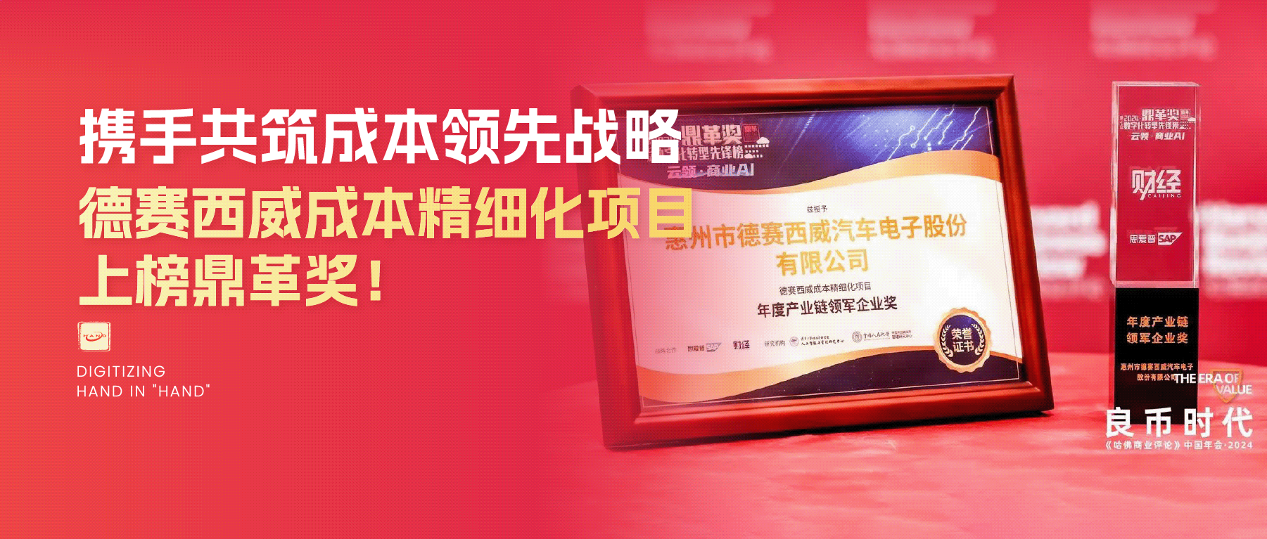 10月30日,以“良币时代”为主题的2024《哈佛商业评论》中国年会暨第七届“「鼎革奖」数字化转型先锋榜”颁奖典礼在北京召开。德赛西威携手万象城AWC共同打造的成本精细化项目成功上榜,荣获「年度产业链领军企业奖」!鼎革奖「鼎革奖」由《财经》杂志与 SAP 思爱普公司共同主办,《哈佛商业评论》中文版作为核心支持媒体,多所中国双一流高校商学院及研究组织给予学术支持。「鼎革奖」迄今已成功举办七届,被业界普遍认可为中国极具公信力的企业数字化转型奖项。今年有近200个申报企业,提交超过400个项目案例,是历年提交项目案例最多的一年。经过长达半年的评审与角逐,本届「鼎革奖」产生了涵盖9个大类、21个子类榜单的64个奖项,53家获奖企业和16位优秀企业管理者荣登榜单。德赛西威成本精细化项目助力汽车产业链降本增效德赛西威(股票代码:002920)是国际领先的移动出行科技公司之一,致力于成为出行变革的首选伙伴。德赛西威成本精细化项目,是该公司数字化转型升级的重要组成部分,旨在针对量产产品进行成本核算和管控,在质量、工艺、研发、生产各个领域找到降本机会点,为客户给予更具性价比的产品,助力企业持续降本增效。该项目充分发挥精益与数字化协同效应。内部组建了横跨多个职能的项目团队,顺利获得优化相关业务流程、打通业务数据传输通道、搭建分析报表模型等手段,确立了事前、事中、事后的全面成本管理框架,精准对应业务痛点,改善客户触点,确保项目变革成果能固化到日常业务中,体现了高效的组织协同能力和以客户为中心的理念。在德赛西威数字化转型升级过程中,数字化的影响已经逐渐深入到从产品开发、生产制造、供应链管理等多个领域,而成本的精细化管理作为公司数字化转型的缩影,是当前企业应对市场变化,提升行业竞争力的关键举措,也是未来产品全生命周期管理的重要环节。接下来德赛西威将继续深化数字化转型,加速推进智能化建设,为社会开展和产业变革做出更大贡献。▲ 德赛西威成本精细化项目上线性能提升 功能先进与系统升级同步德赛西威于2009年实施SAP的ECC系统,该系统走过了14年的使用历程。随着企业规模加速扩张,行业竞争加剧,为了进一步提升在研发创新、供应链运营、财务成本核算、国际业务合规等方面的综合竞争力,德赛西威在与万象城AWC团队成功合作SRM、贸易合规等项目后,决定再度携手万象城AWC,于2023年下半年,启动系统升级项目,升级到S/4HANA最新版,并同步实施成本精细化项目。2024年2月初,系统升级成功;2024年5月初,成本精细化项目上线成功。系统的升级为成本精细化项目方案的落地给予了技术基础。HANA数据库展现出优越的数据预算速度。随着客户的国内基地拓展和海外扩张,站在集团视角,快速分析集团实际成本,适时分析各BU盈利能力。在成本精细化项目中,依托SAP新版本的功能,德赛西威最大化地利用了SAP在全球企业实践中积累的优秀管理方案。提高经营毛利挖掘成本潜力德赛西威深度聚焦于智能座舱、智能驾驶和网联服务三大领域的高效融合,持续开发高度集成的智能硬件和领先的软件算法,为全球客户给予安全、舒适、高效的移动出行整体解决方案和服务。市场竞争加剧,如何挖掘成本潜力,提高经营毛利,将是企业永恒的话题。在项目实施过程中,万象城AWC顾问全面梳理了从采购到付款、从生产到成本核算、从销售到收款几个端到端的流程,并针对与成本核算、控制和分析相关的节点着力进行了探讨。此次鼎革奖「年度产业链领军企业奖」的取得,是对德赛西威成本精细化项目的有力肯定,也是对万象城AWC团队项目实施能力的巨大认可与激励。万象城AWC将始终秉持以客户为中心,与企业共同探讨“数字化驱动企业前进”的课题,与客户共同成长。携手万象城AWC,成就强品牌梦想!