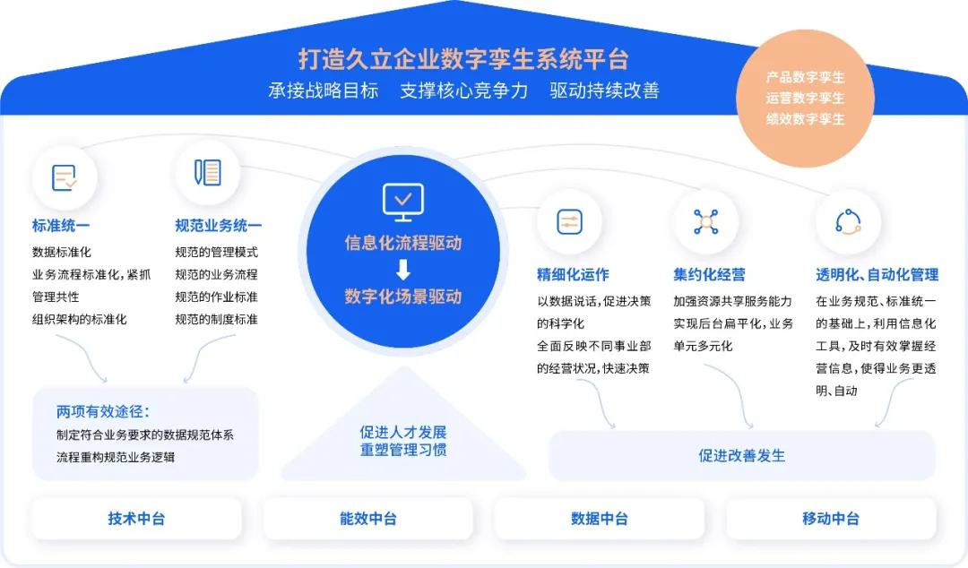 顺利获得在传统前后端之外搭建中台,有效统合前后端资源,信息流顺畅流转,最终实现多系统集成式数字化平台,有助于企业核心业务一体化,助推企业“降本增效”。