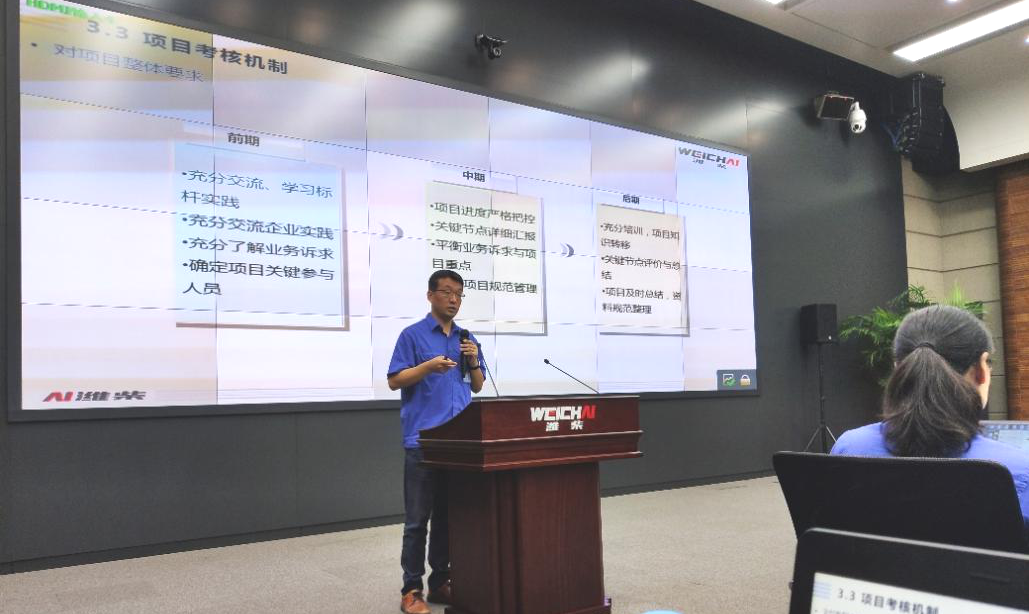 潍柴集团财务部部长王学文担任此次潍柴方的项目经理,他从项目实施保障方面介绍了项目团队、项目沟通机制、项目考核制度等内容。对此次项目,王部还提出了四点期望与要求:
