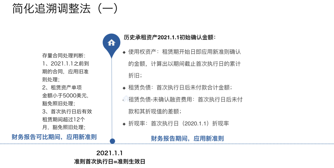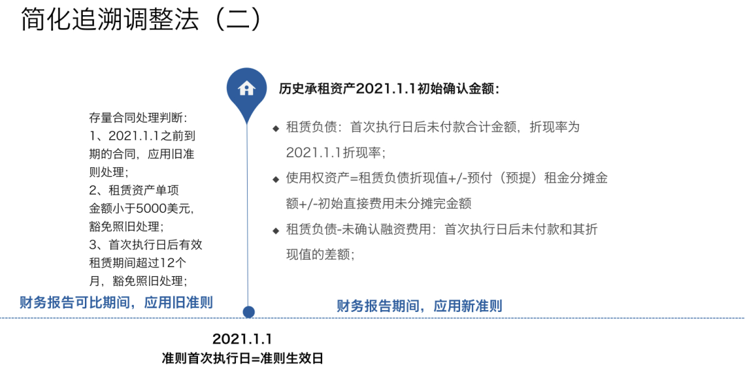 该方法处理思路和完全追溯法类似,但不用计算上年可比期间数据,直接在准则生效日(2021年1月1日)确认存量承租资产的使用权资产和租赁负债初始入账金额,确认方法如下: