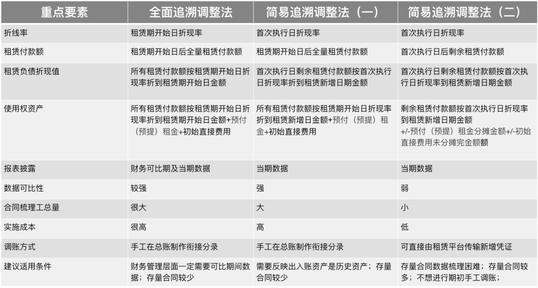 全面追溯调整法最能反应承租资产在新准则下的业务实质,具有清晰的上年数据,可用来帮助企业制定财务管理决策,但需要梳理大量合同信息,还要对2020年全年的数据进行处理和列报,时间、人力和金钱成本都很大,除非要求有可比期间数据,不推荐使用;
