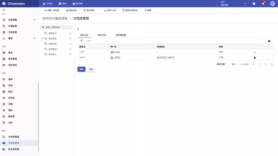 权限管理:分配文档库权限,可以精细到目录维度。支持分配权限、更新权限、删除权限
