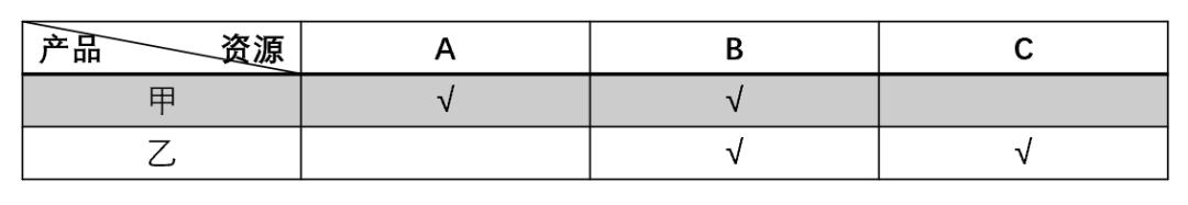 【例】某工厂有3条产线A\B\C,生产甲、乙两种商品,其中甲可在A、B线生产,乙可在B、c线生产。如此所形成的产品资源矩阵是产能模型的基础形态,仅仅表达范围。