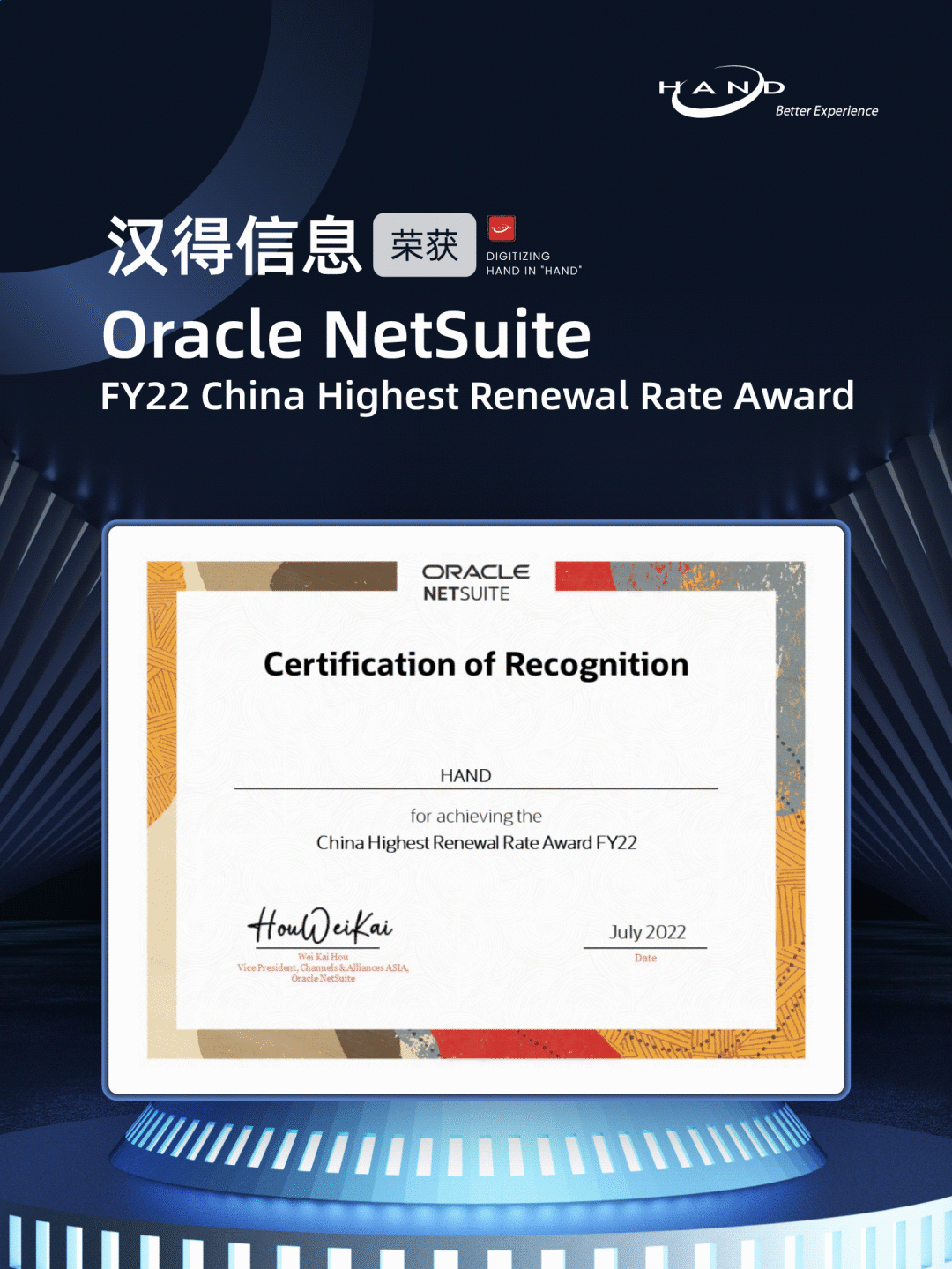 2022年7月22日的Oracle Netsuite Asia Conference 2022,万象城AWC荣获ORACLE NetSuite中国区Highest Renewal Rate (最高复购率) 合作伙伴奖项。