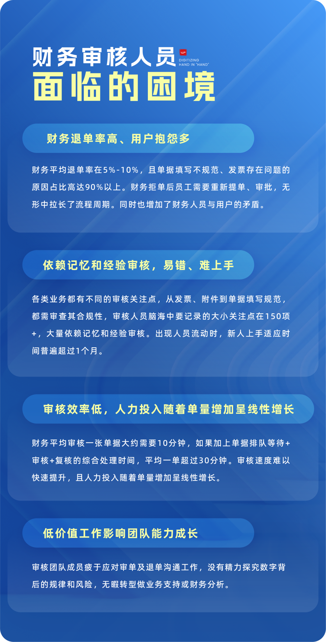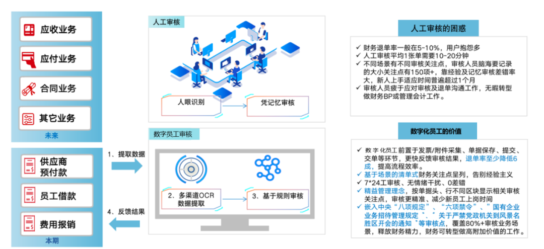 不同的业务场景下,审核关注点大不相同!审核一张单据,审核人员需要记忆一百多项大小关注点,依靠经验及记忆,审核差错依然难以避免。数字员工智能审核按照各场景的清单式财务关注点、逐条按规则审核,高效、快捷、告别经验主义。