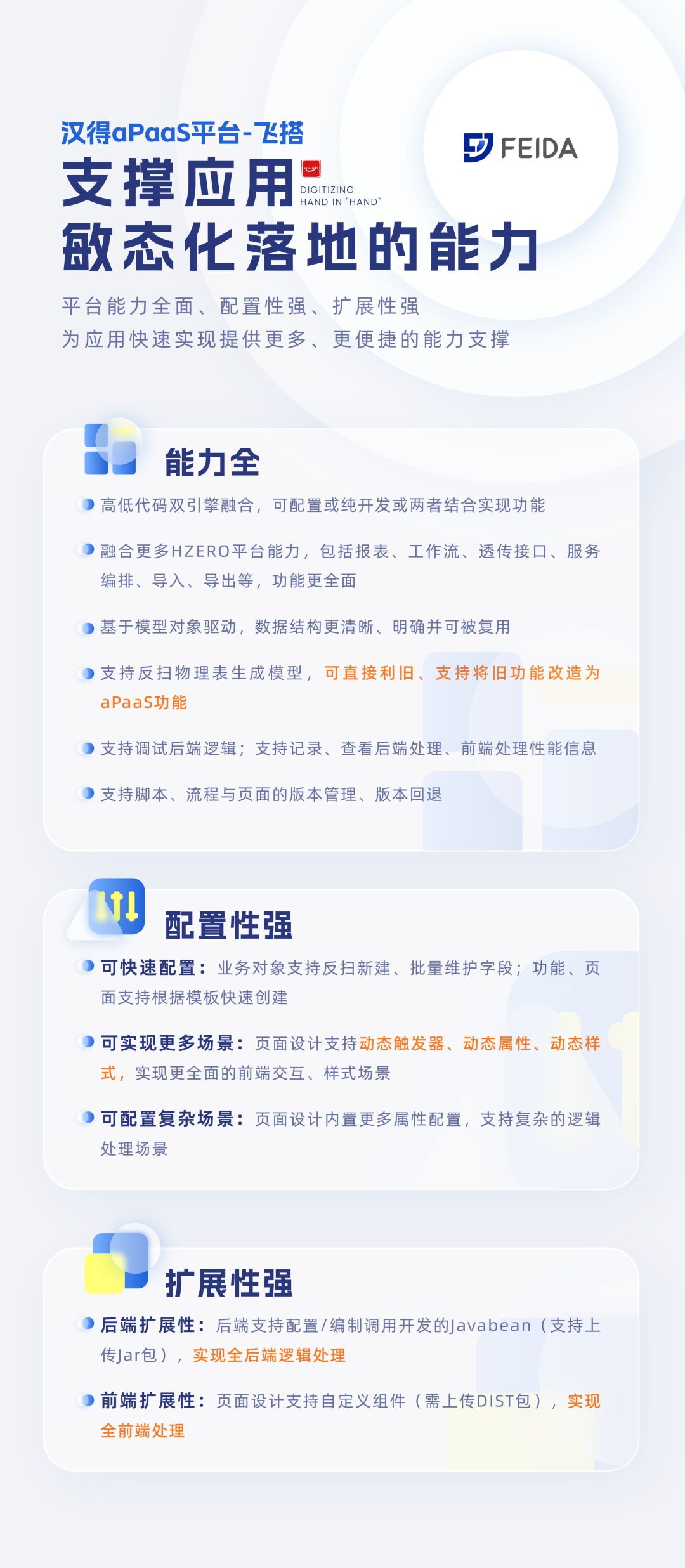 飞搭 FeiDa 是基于低代码理念打造的融合化 aPaaS 平台,助力企业快速搭建业务应用。作为 HZERO 生态的重要组成部分,致力于充分融合  HZERO 的各平台能力,给予普惠化、敏态化、低成本的应用搭建解决方案。