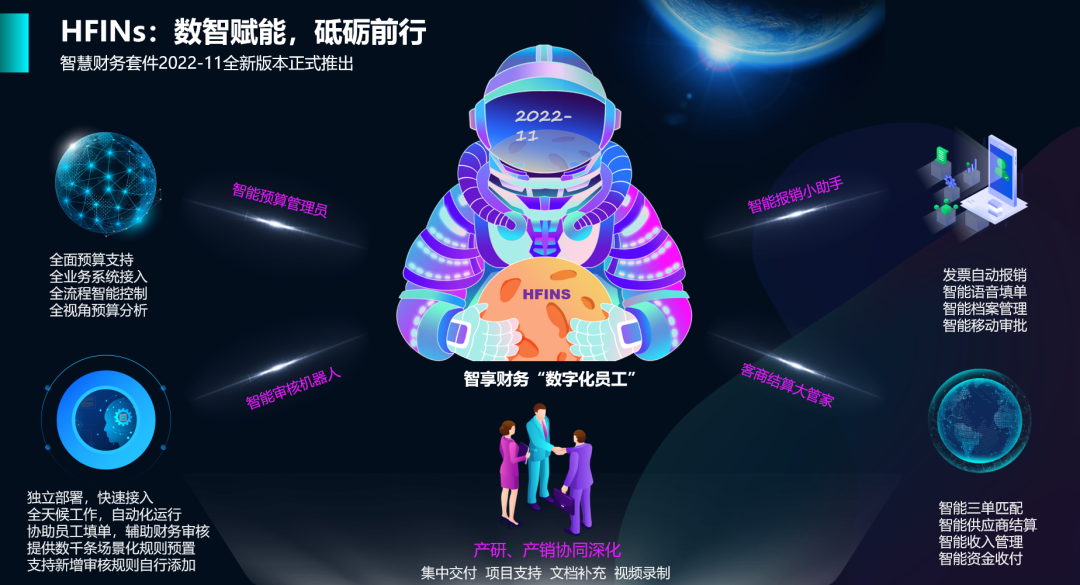 构建以业财一体化报账平台、智能财务共享平台、经营成果评价平台和电子票税管理平台为基础的智能财务管理体系。并顺利获得对人工智能和机器学习技术的探索和应用,推出全新的企业“数字化员工”,满足企业在数智化时代“降本、促收,共享、透明”管理诉求。