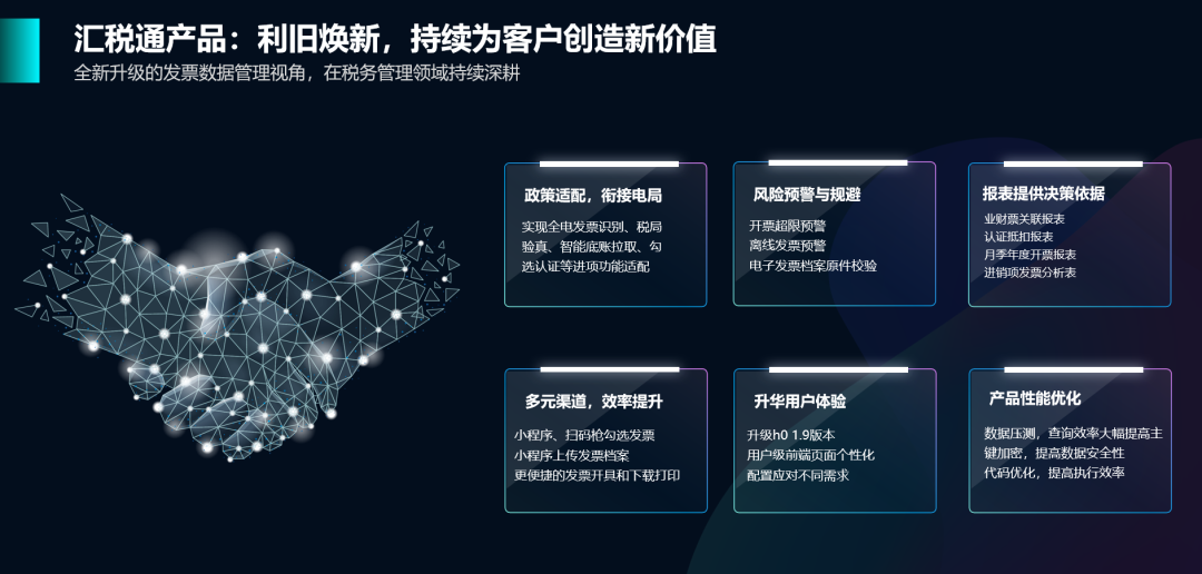 在发票采集角度,不断拓展多元化采集渠道,力求为客户给予更便捷、更高效的解决方案。在产品性能与用户体验上,大幅提升查询效率,提高数据安全性,防范风险,同时实现部分页面用户级个性化,帮助企业实现数智化时代票税管理的转型升级。