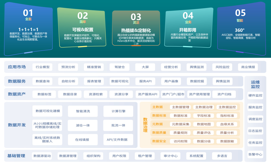 万象城AWCH-ONE融合数据平台,引领企业数字化转型的“大国重器”,助力企业轻松解决数据存储计算,全方位数据治理,数字“黄金资产”-主数据的标准化、规范化管理,实现数据资产智能化运营,为企业构筑起完整而创新的数据要素生态。H-ONE不仅是一个体系化的数据平台,更是企业数据要素价值的释放者,为您开启数据要素之旅,实现业务的全面升级,激发创新能量,打造数字化成功的新篇章!
