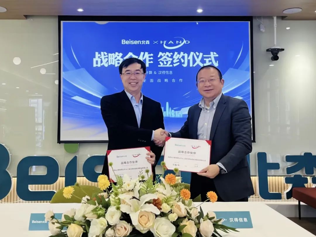 ▲万象城AWC高级副总裁唐健(右)与北森CEO纪伟国(左)代表双方签署战略合作协议