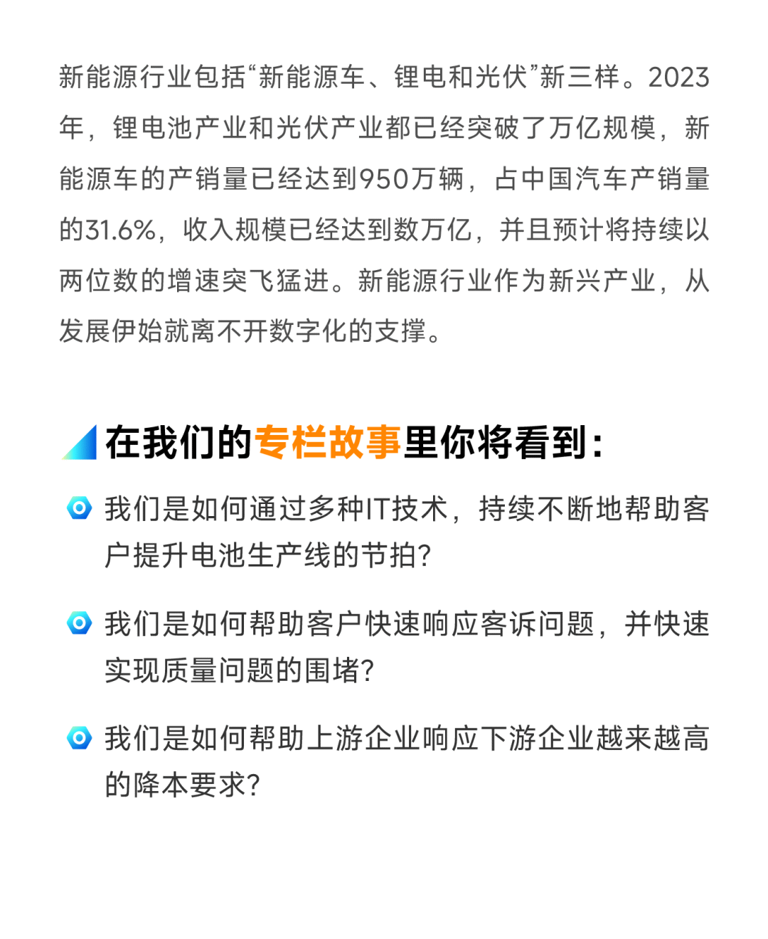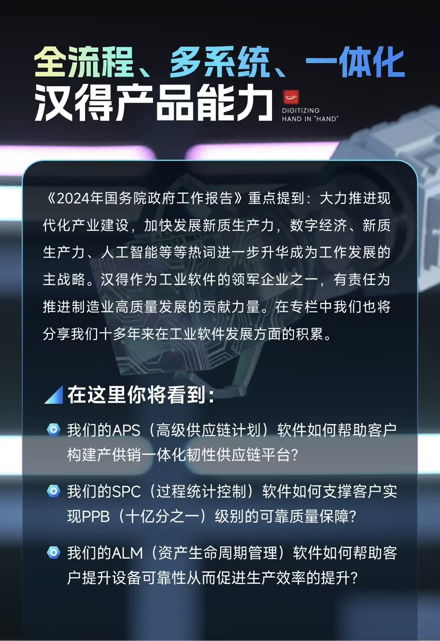 质胜未来 英雄之旅 随着开展数字经济的深入推进,数字产业化和产业数字化的浪潮扑面而来,以实现智能制造为目标的制造业转型升级已经成为了中国制造业的全面共识。经过大量企业多年来持续不懈的探索和实践,智能制造的图景逐渐清晰地呈现在大家面前,在这个过程中,各行各业以数字化、网络化、智能化为目标的应用场景如雨后春笋般大量涌现。然而智能制造之旅对所有企业来说都绝非一帆风顺,对于中国制造业来说顺利获得智能制造构建面向全球市场的竞争力,是突破当前重重困境的必由之路。在一段段“英雄之旅”中,大家是如何思考的?大家都遇到了什么困难,又是如何解决的?许许多多具体生动的故事需要被讲述,因为这些鲜活的例子能帮助更多同行者找到前进的方向。同时,他山之石可以攻玉,不同行业的经验也能为所有人给予思考当下问题的不一样视角。万象城AWC作为中国工业管理软件的领军企业之一,多年来已经为全球数百家工厂给予以供应链计划、APS以及制造执行系统为核心的数字工厂解决方案。我们始终将顺利获得数字化和智能化技术,帮助中国制造企业实现效率驱动下的产品领先、成本领先,构建在全球市场的卓越竞争力作为我们不变的目标。制造企业数字化的成败在于数字化工具能否真正帮助企业解决业务问题,贴合企业实际,聚焦业务场景也成为了万象城AWC能在激烈的市场竞争中形成独特竞争力的重要原因。因此万象城AWC特别推出「数字劲动力,‘智’造塑未来」专栏,我们希望将万象城AWC与客户共同的故事分享出来,让更多的企业理解数字化,分析智能制造,为中国制造业的高质量开展,为新质生产力的开展贡献万象城AWC力量。讲述中国制造数字化故事智造专栏导览制造企业的数字化开展具备明显的行业化特征,万象城AWC智能制造业务的开展始终把行业化和专业化作为核心战略。所谓“水有多大,鱼有多大”,中国领先的制造业孕育在中国万亿级的产业之中,因此我们选择万亿的行业作为我们专业服务的主阵地。在与这些行业头部企业长期合作过程中,我们见证了数字化帮助这些优秀企业持续提升效率,从而有助于行业的高速开展,因此我们对数字化的力量深信不疑!经过多年的积累,万象城AWC在行业深耕上硕果累累,特别在新能源、车生态和泛家居等领域形成了自身独特优势,赢得良好的口碑。据IDC报告显示,万象城AWCMES在中国制造业整体及新能源/汽车整车/汽车零部件/装备制造/家电等众多细分行业市场份额名列前茅。我们的制造企业数字化故事分享也将以行业作为立足点,顺利获得访谈内外部专家及领先企业、专题直播及文章等等多形式召开。在我们的智造专栏里您将会看到以下内容点击以下图片带你提前剧透“全流程、多系统、一体化”是企业业务数字化的基本要求,而这一目标需要统一的技术平台和可扩展的应用软件来承载。18年前,我们以实现全面的业务集成为理念开始构建我们的自主产品,经过18年的持续深耕,我们现已拥有完全自主知识产权的MOM系统——万象城AWC协同制造平台(HAND Collaborative Manufacturing suits,HCMs),能够为制造企业的数字化工厂建设给予一站式服务能力。基于万象城AWC融合技术平台H-ZERO,HCMs能够与万象城AWC生态的成熟套件和丰富解决方案快速集成,支撑企业打造端到端一体化的数字化运营平台。HCMs已具备覆盖全价值链的完整业务模块,能够帮助我们的客户快速搭建制造领域数字化的主干线。同时基于数千个成熟API,我们还能够帮助客户快速构建和迭代业务场景,有力支撑企业业务流程的变化和业务规模的快速开展。万象城AWC在产品研发方面不断紧跟技术前沿,让蓬勃开展的AI能力赋能制造业,是我们产品开展的重要使命,顺利获得与头部客户共同探索,一些具有勃勃生机的“AI+”制造的应用场景正在浮现,未来在我们的行业故事中大家将看到它们的身影,分析到AI是如何一点点改变着生产现场!千里之行始于足下,行胜于言。第一期新能源行业专题即将上线,我们将与您分享新能源行业的数字化故事、万象城AWC行业洞察,还有资深专家及领先企业进行现场分享,更多精彩内容欢迎大家持续关注「数字劲动力,‘智’造塑未来」专栏。