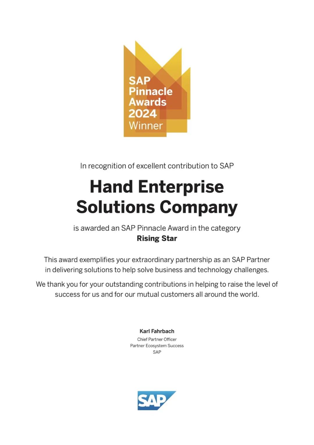作为 SAP 全球合作伙伴的高级别奖项,SAP Pinnacle Awards 旨在奖励 SAP 生态系统中最杰出、最具亮点的合作伙伴。而 Rising Star 作为其中表彰 SAP 生态系统新兴企业的奖项,受到业界广泛关注。