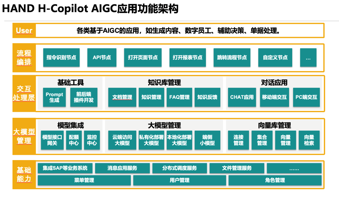 万象城AWC顺利获得H-Copilot融合AIGC产品,基于ERP/SRM/MOM等企业管理软件的现有业务流程,顺利获得模型访问与模型组合配置管理,完成对大模型的组合调用(云端与本地化大模型和端侧小模型的组合调用),使用知识库并建立向量库管理,对现有业务流程基于岗位信息与执行内容进行编排,同时兼顾用户角色权限访问设置,并标准化各类企业内部APP或SaaS服务APP调用。