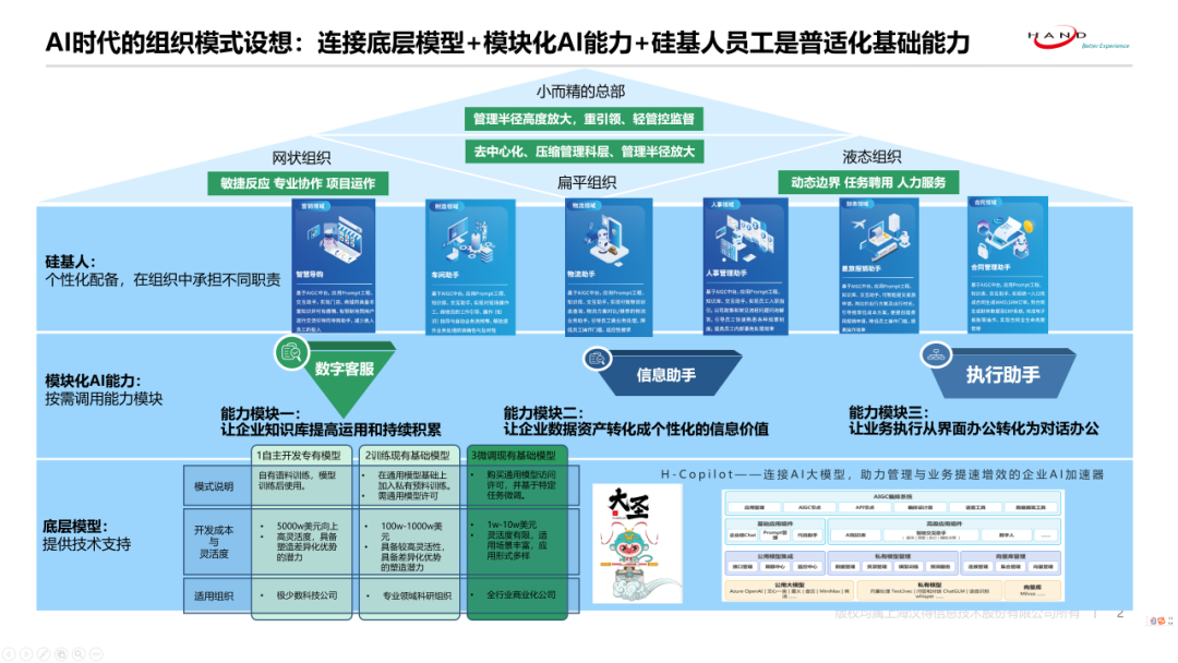 1、传统企业组织金字塔结构将向松树结构转化,硅基人的辅助效果和替代作用从基层向中层将持续增强。组织趋向扁平化,层级减少,管理半径增大,人才密度增大。
