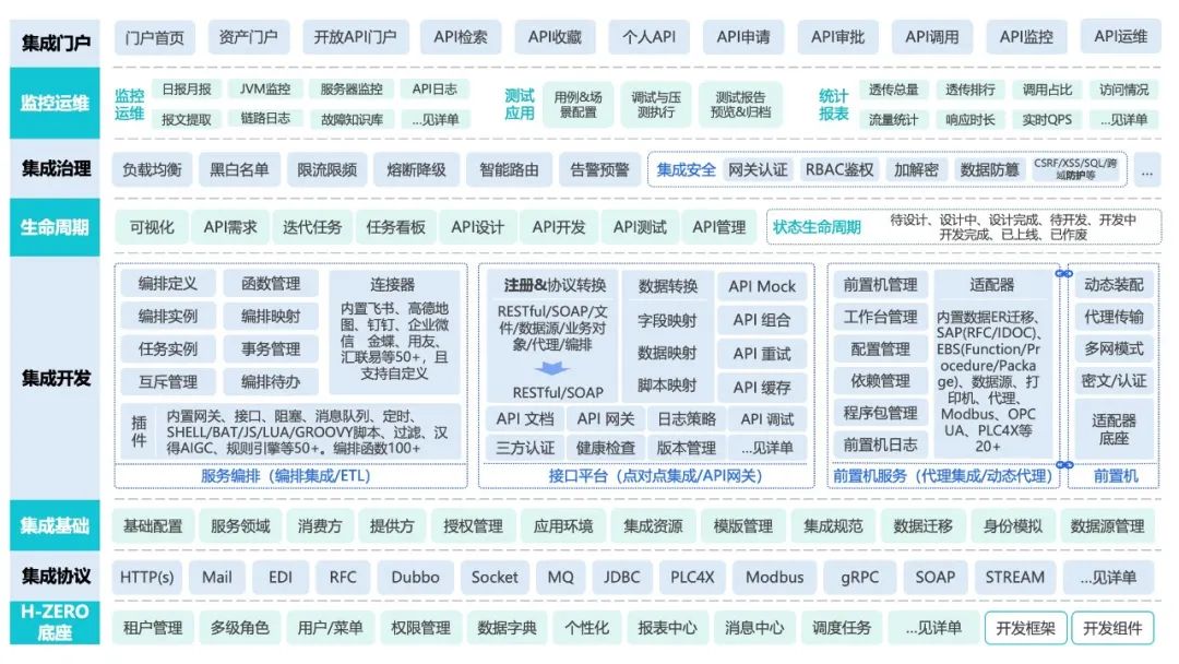 基于H-ZERO技术底座的iPaaS集成平台集星獭,实际上由H-ZERO平台的五个服务模块组成,能够给予一站式全域集成解决方案,涵盖多系统、多云、多端、多协议、多设备、数据和页面的集成。