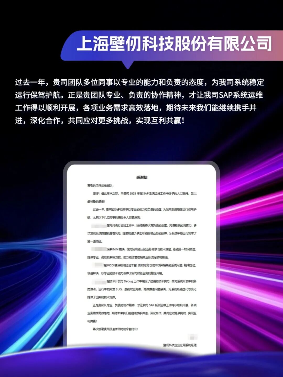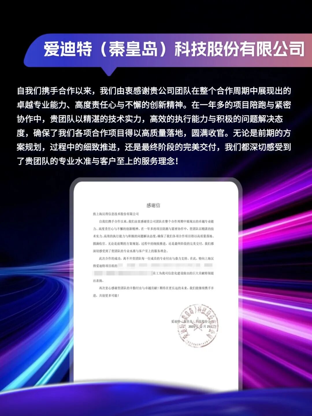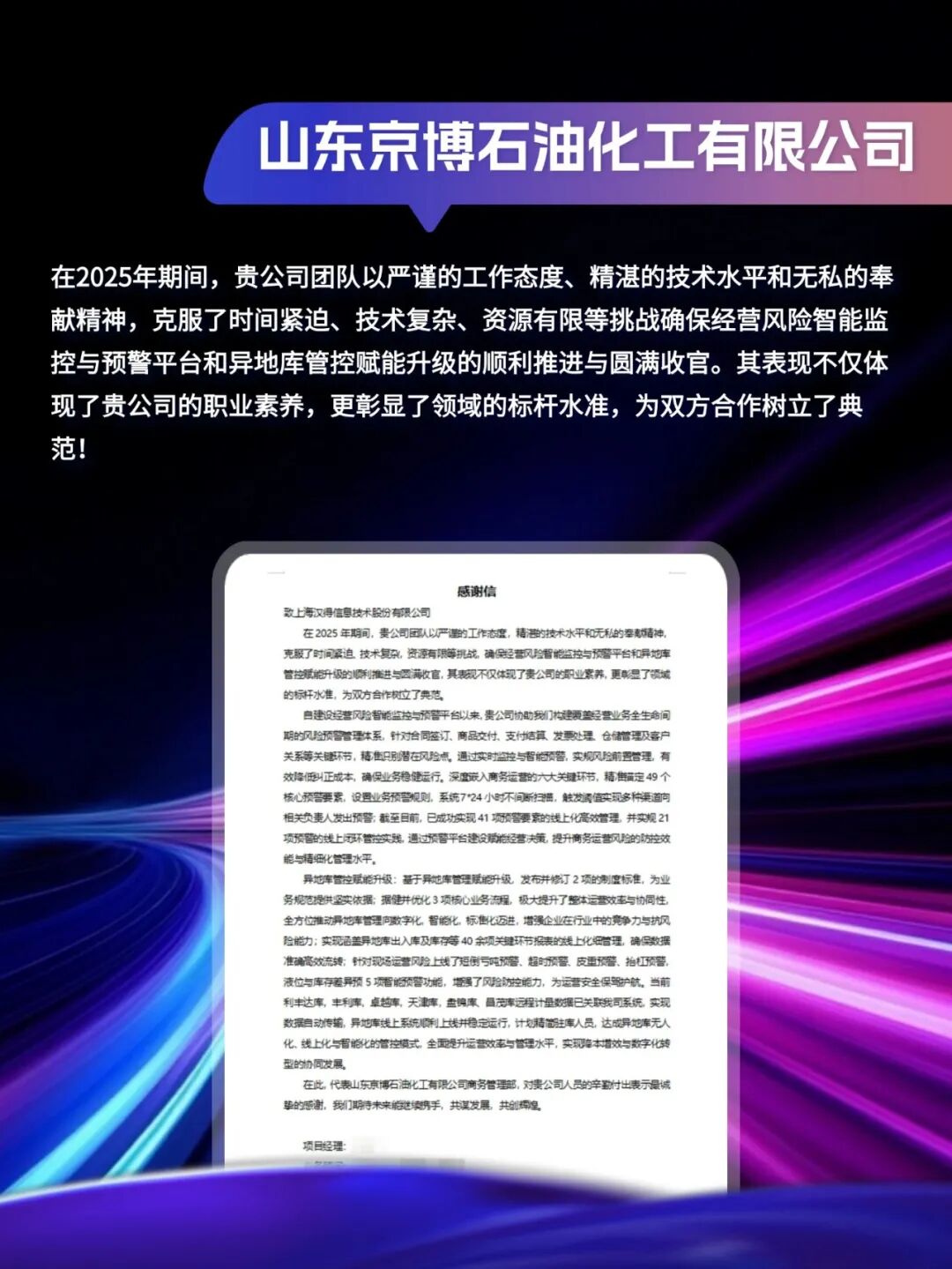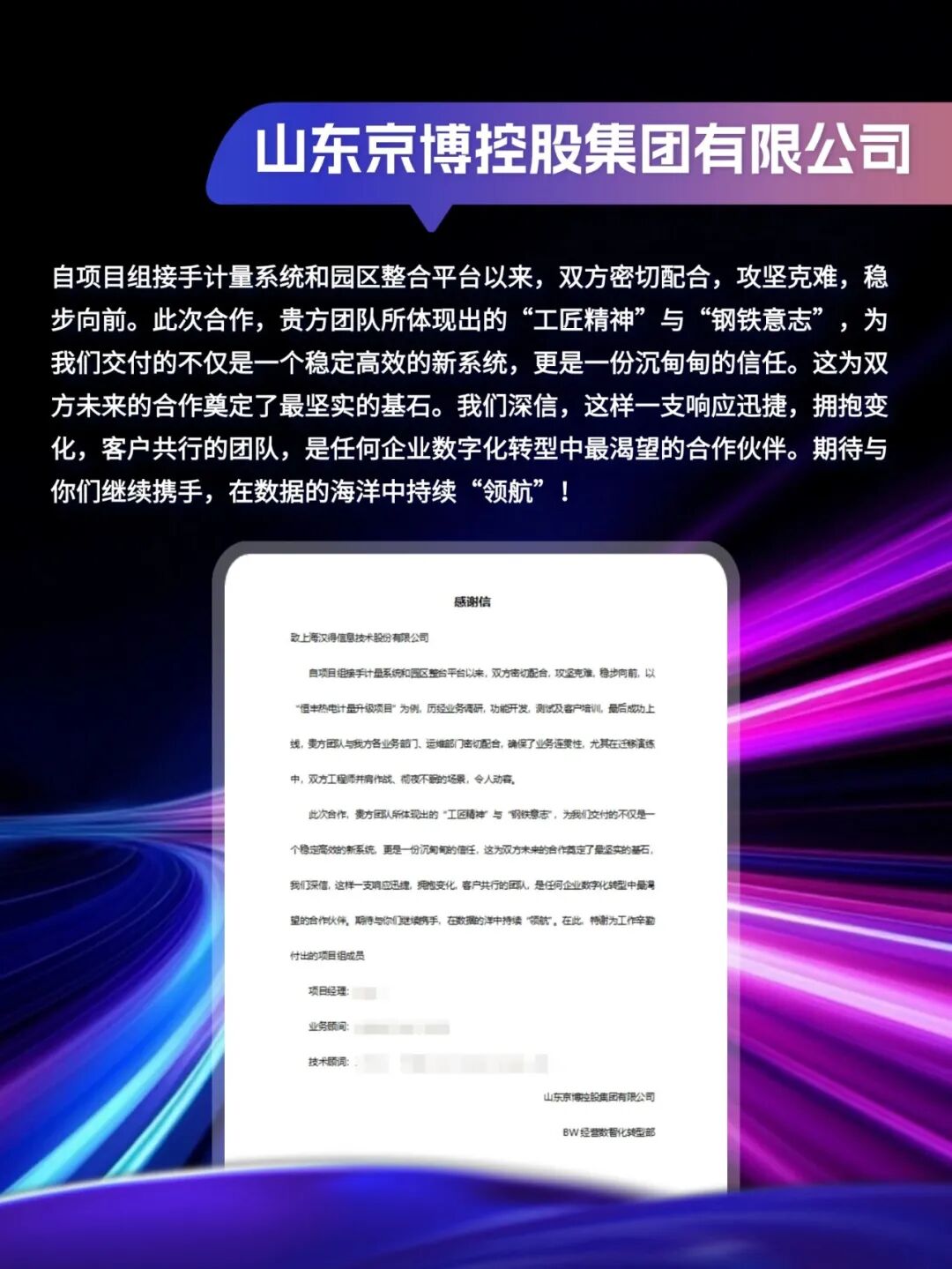 同心致远,智筑华章, 一路相伴,感恩同行。 在产业数字化与智能化的征程上, 万象城AWC始终与客户并肩同行, 以数智为犁深耕价值, 以初心为炬照亮前路, 携手跨越每一次挑战,共赴每一场成长。 从方案落地到效能跃升, 从携手攻坚到共创共赢, 每一段并肩前行的时光, 都凝结着双向奔赴的信任与默契。 以下收录了部分客户感谢信 一封封真挚的感谢信, 是字里行间的温暖认可, 是岁月沉淀的专业肯定, 更是我们深耕数智领域的底气与荣光。 感谢每一位携手同行的客户伙伴, 一路信任托付,并肩耕耘相伴。 我们将继续以专业为笔,以初心为墨, 与客户伙伴同心深耕数智沃土, 并肩奔赴更璀璨的未来。 携手万象城AWC,共铸硬核竞争力!