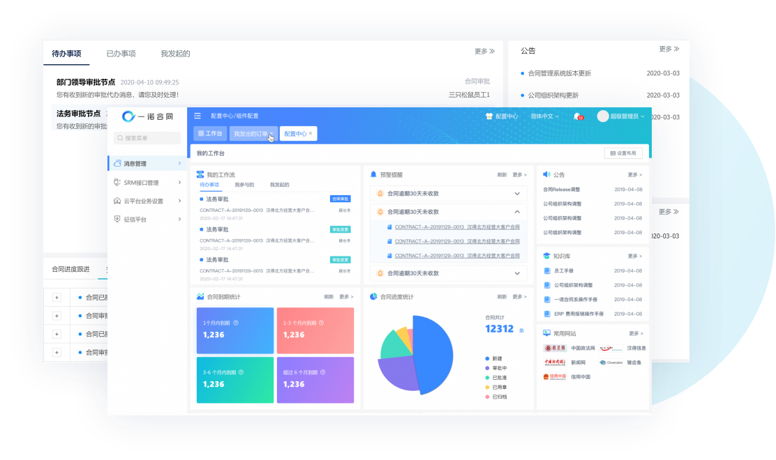 拉通企业内部ERP、SRM、CRM等业务执行系统,合同驱动业务执行,跟踪执行进度